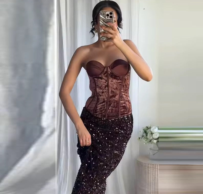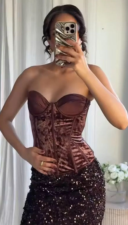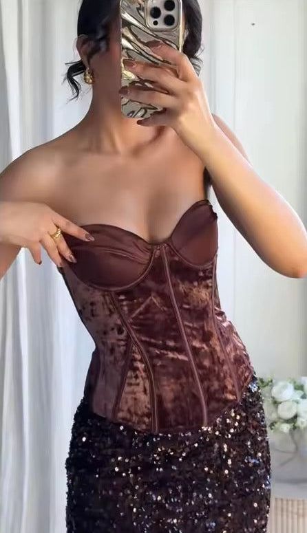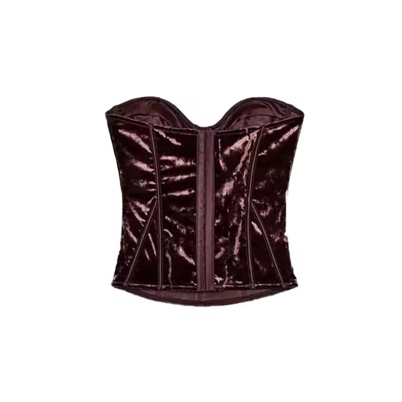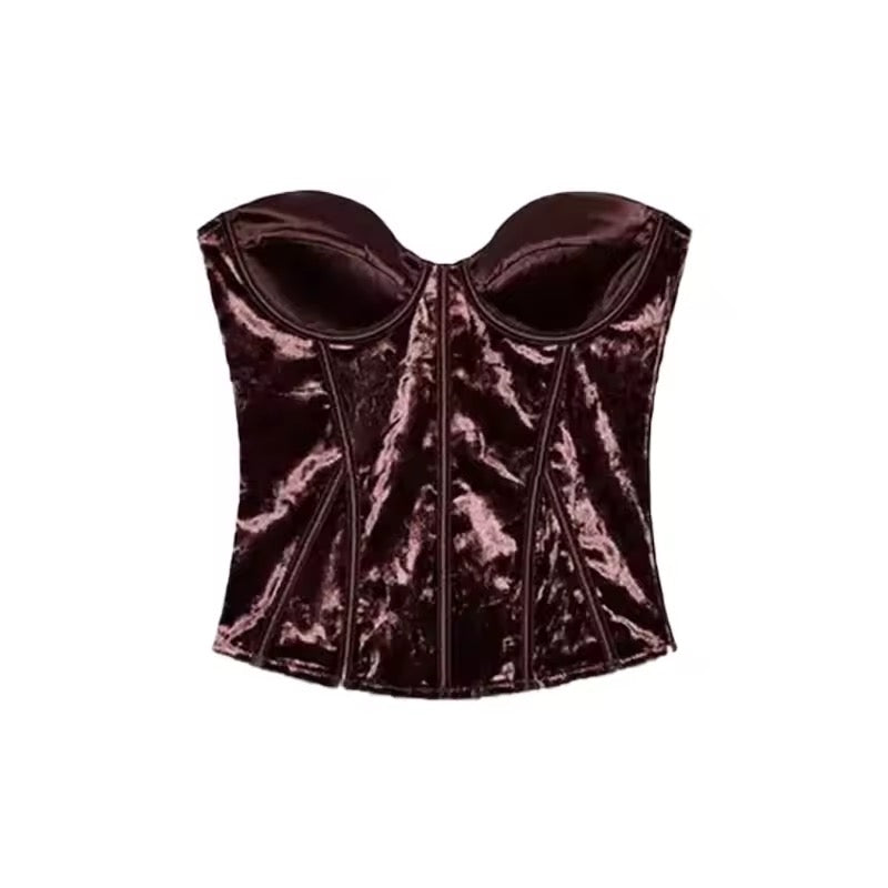 Tauche ein in zeitlose Eleganz mit diesem burgunderroten Samt-Bustier – ein vielseitiges, trägerloses Corset Top, das Weiblichkeit und Retro-Glamour perfekt vereint. Der schimmernde Veloursstoff schmeichelt der Haut und sorgt für einen luxuriösen Look, während die formgebenden Stäbchen und der taillenbetonte Schnitt für eine traumhaft schlanke Silhouette sorgen.