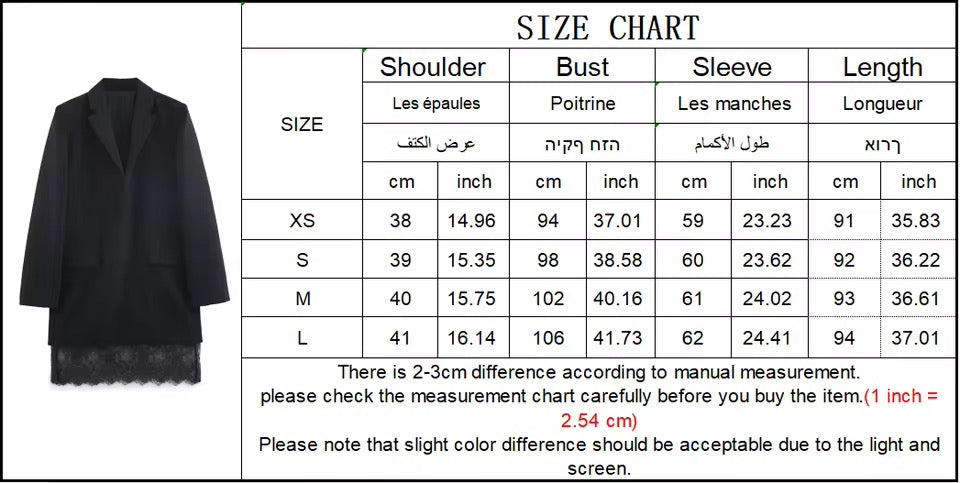 Der lange Reverskragen sorgt für einen klaren, modischen Look, während die praktischen Klappentaschen dem Kleid Struktur und Funktionalität verleihen. Der feine Spitzensaum setzt einen romantischen, femininen Akzent und schafft einen wunderschönen Kontrast zum cleanen Anzugstil.