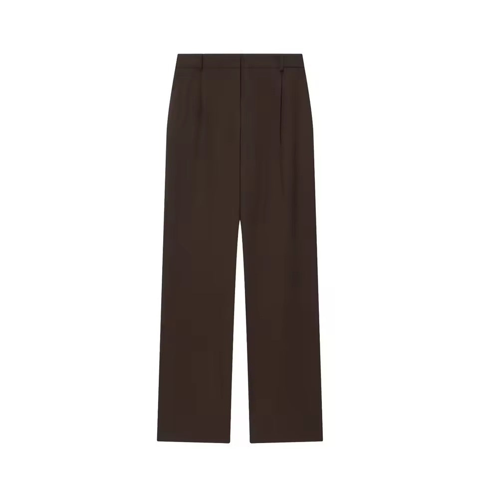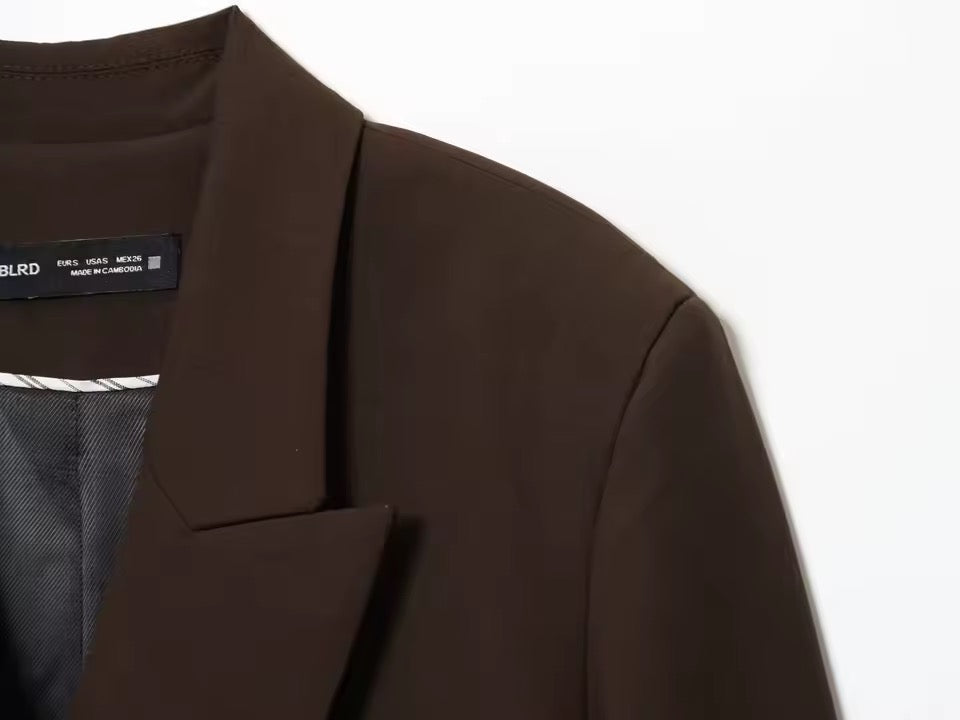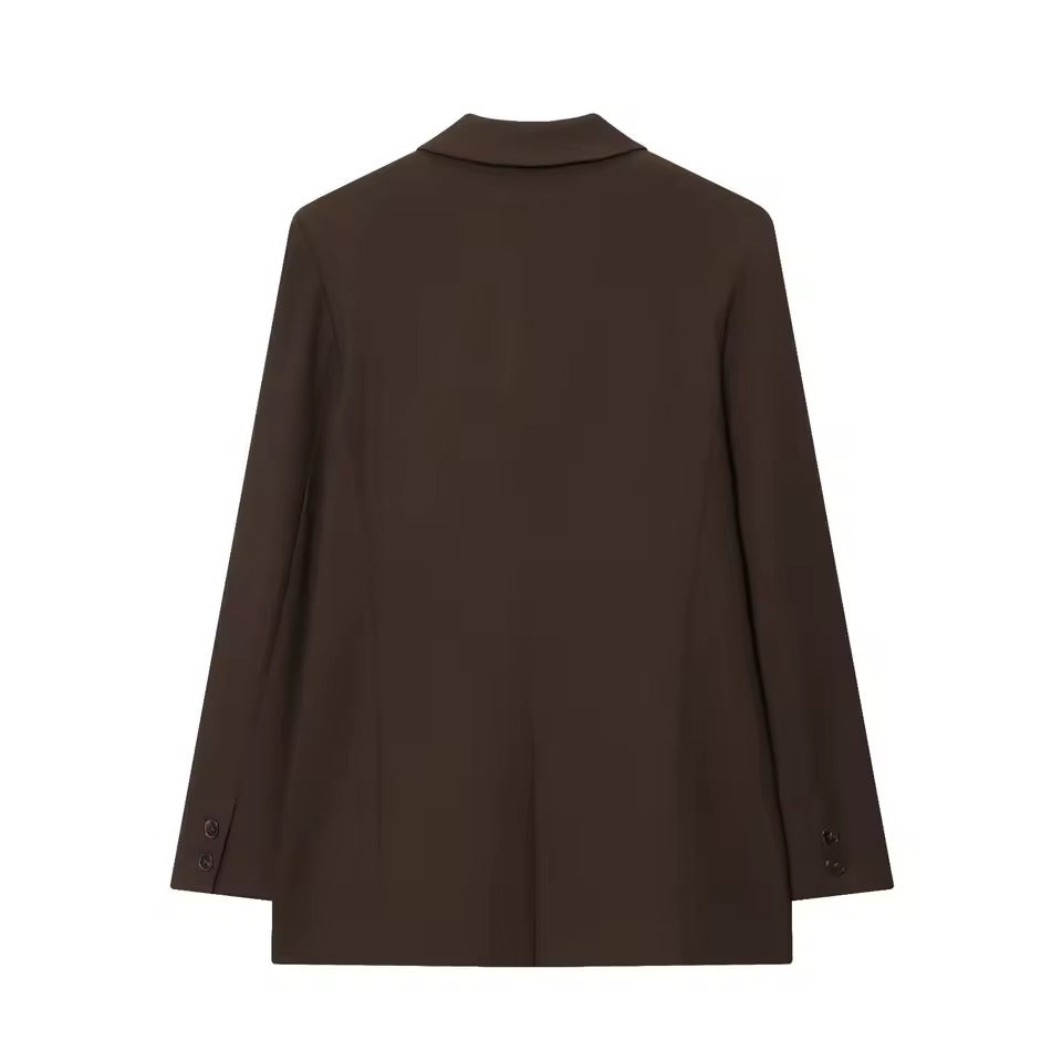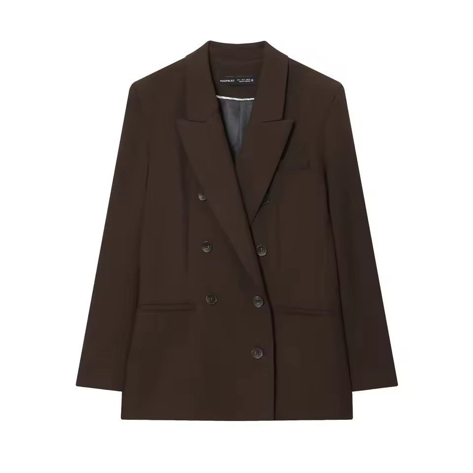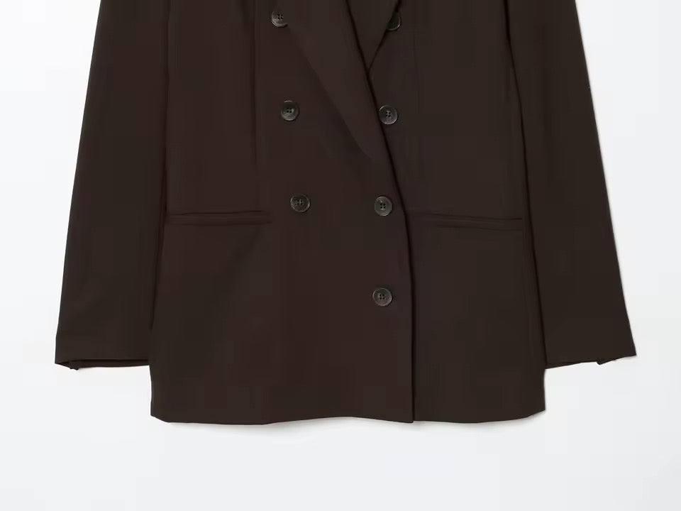 Dieses zweiteilige Damen-Anzug-Set vereint klassische Eleganz mit modernem Chic. Die zweireihige, zugeknöpfte Jacke verleiht deinem Look Struktur und Professionalität, während die High-Taille-Hosen die Silhouette strecken und für eine schlanke, feminine Linie sorgen.