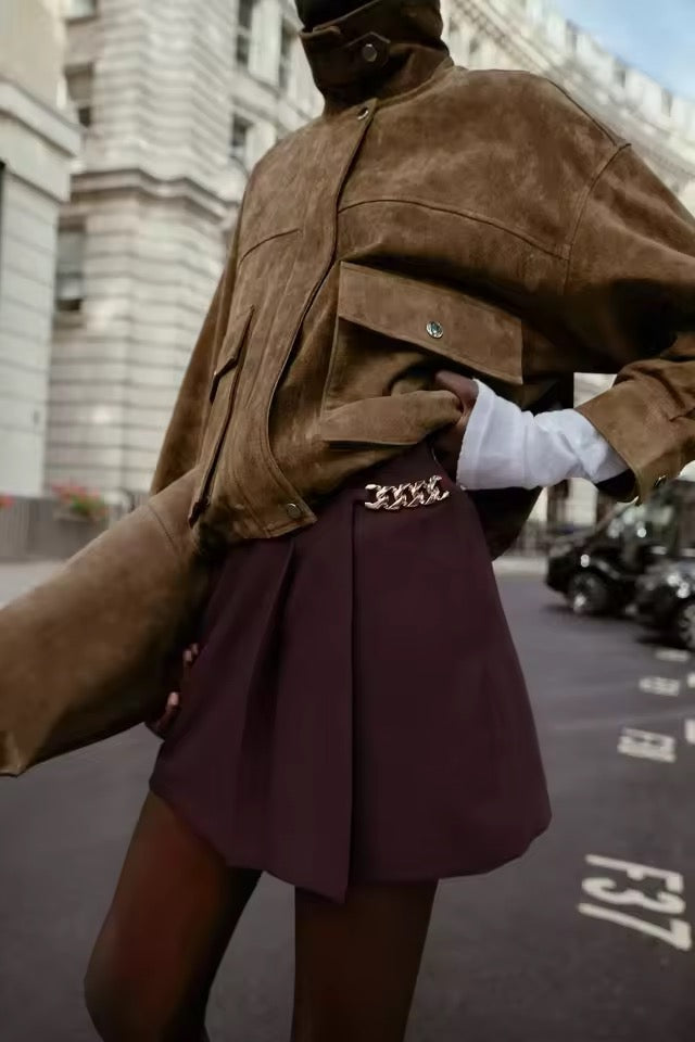 Diese trendigen Shorts sind ein echtes Highlight für die Mode-Saison 2025! Der weite Schnitt mit eleganten Falten, kombiniert mit einer auffälligen Kette als Detail, bringt einen coolen Mix aus Vintage-Vibes und High Street Fashion. Dank der hohen Taille sitzt die Hose figurbetont und lässt sich ideal mit Crop Tops, Blusen oder Oversize-Shirts kombinieren. Perfekt für urbane Looks, Festivals oder entspannte City-Outfits.