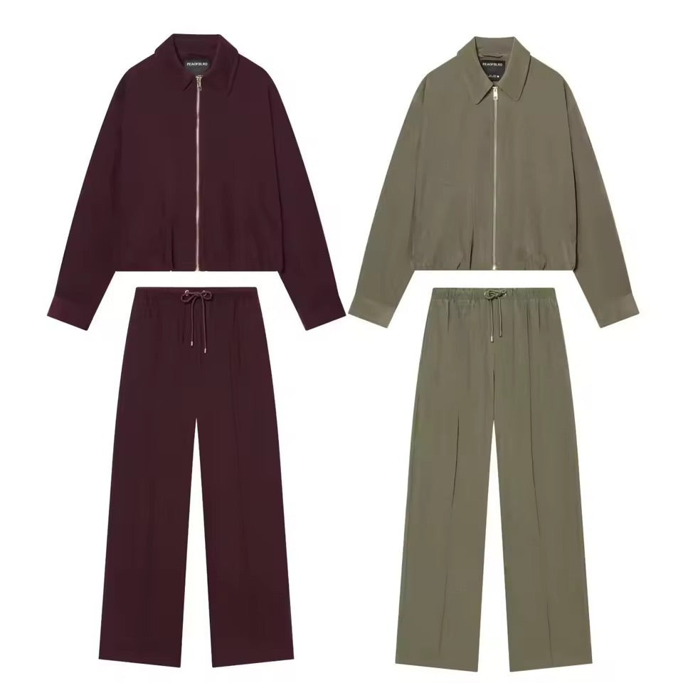 Dieses elegante und zugleich schlichte Damen-Hosen-Set verbindet moderne Lässigkeit mit zeitlosem Stil. Die Pilotenjacke als Oberbekleidung verleiht dem Outfit eine stilvolle Struktur, während die hoch geschnittene Hose mit weitem Bein eine schmeichelhafte Silhouette und maximalen Tragekomfort bietet.