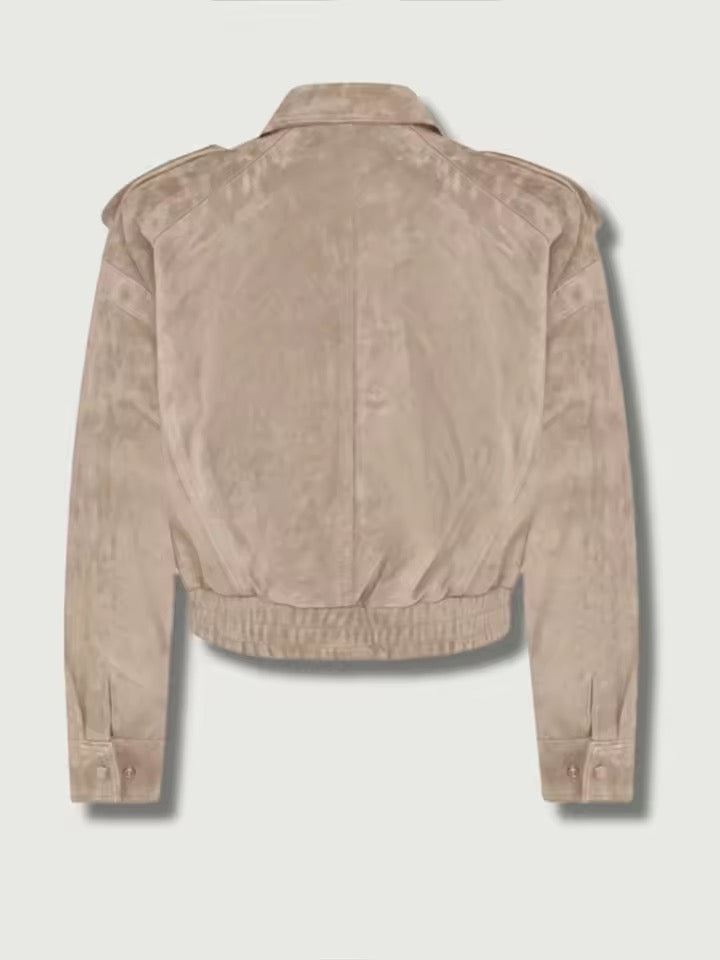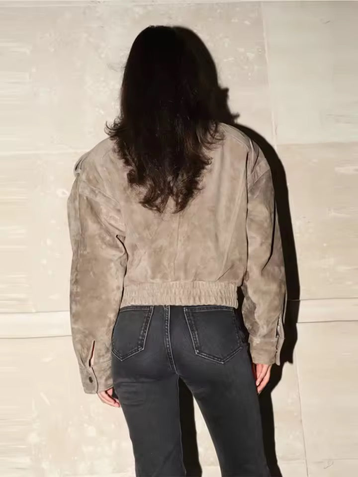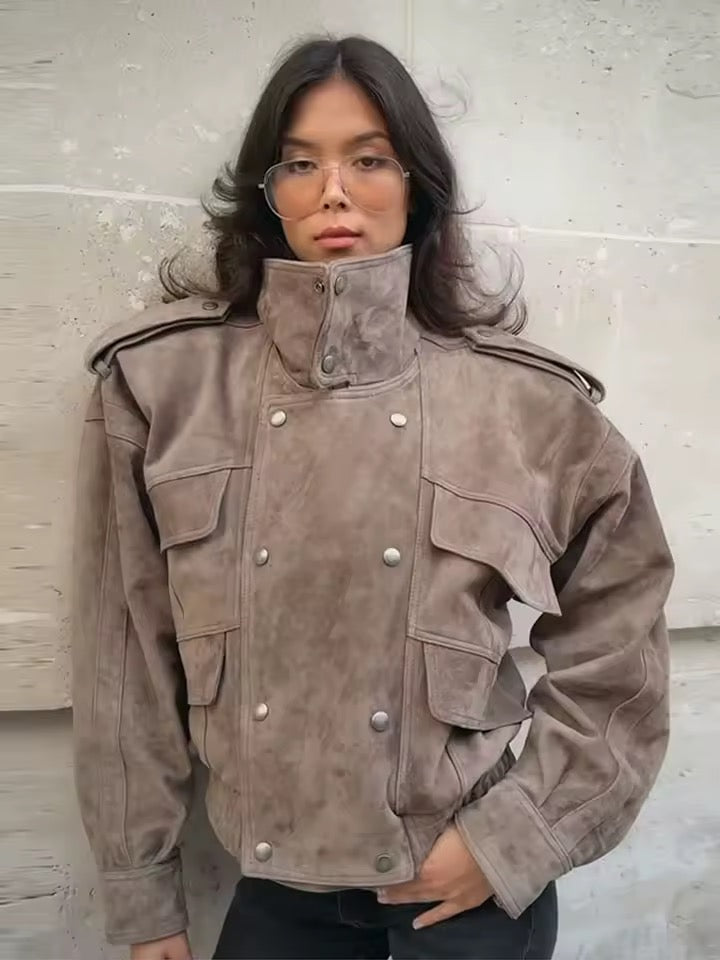 Ein stilvolles Statement für die Übergangszeit: Dieser kurze Wildleder-Mantel im Vintage-Look vereint klassische Eleganz mit modernem Chic. Der markante Stehkragen, die gepolsterten Schultern und das zweireihige Knopfdesignsorgen für eine starke Silhouette und einen edlen Auftritt.