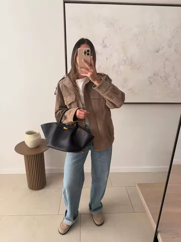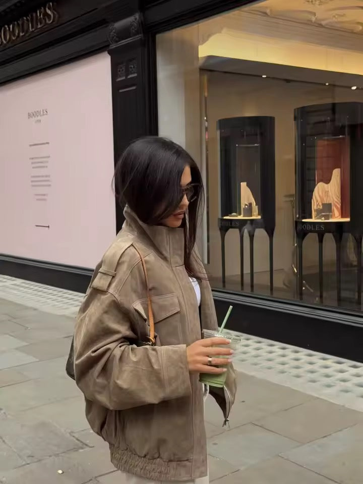 Die KONDALA Chic Wildleder Bomberjacke vereint lässige Streetwear-Vibes mit eleganter Herbstästhetik.