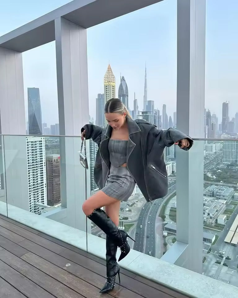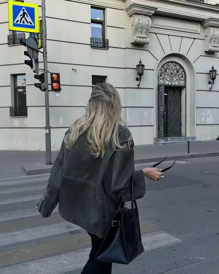 Erlebe lässigen Komfort und stylische Eleganz mit dieser grauen, lockeren Wildlederjacke für Damen – das Must-have für die Herbstsaison 2025. Das klassische Revers verleiht der Jacke einen zeitlosen Look, während die langärmlige Passform und der lockere Schnitt für Bewegungsfreiheit und Komfort sorgen.