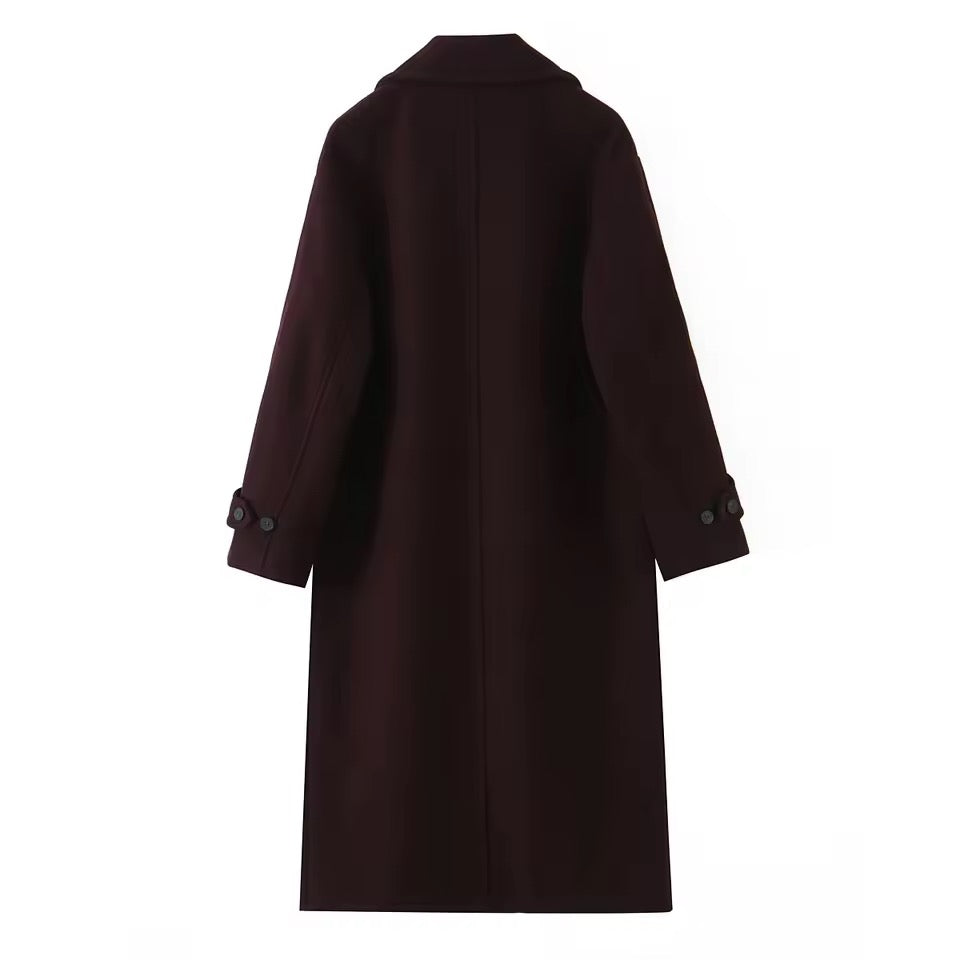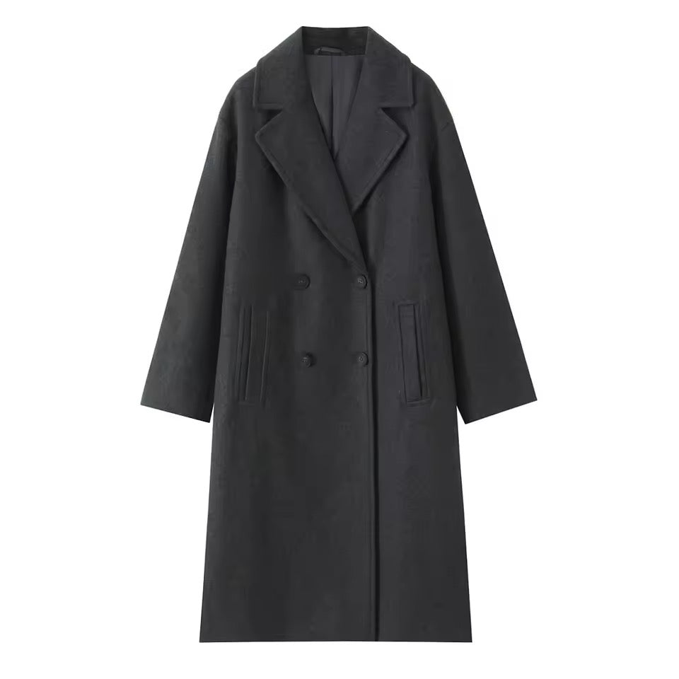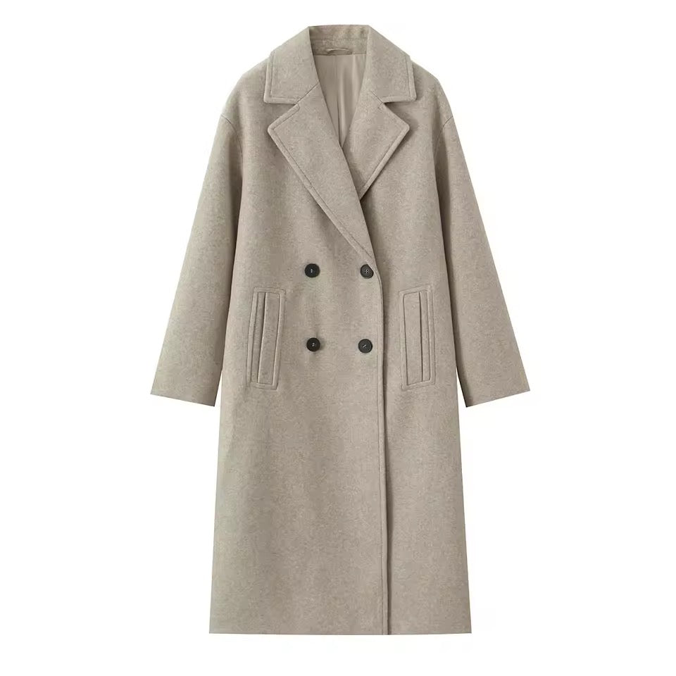 Dieser elegante, lange Wollmantel ist der perfekte Begleiter für stilvolle Auftritte in der kühlen Jahreszeit. Mit seinem klassischen Reverskragen, dem zweireihigen Schnitt und den vollständigen Ärmeln vereint er urbane Eleganz mit praktischer Funktionalität.