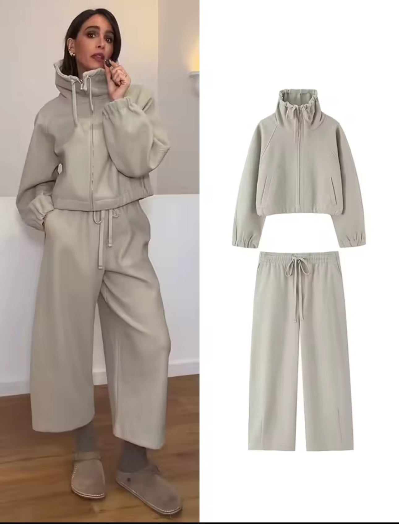 Das Damen Hosen-Set für Frühjahr 2026 kombiniert sportlichen Stil mit moderner Alltagstauglichkeit. Das zweiteilige Set besteht aus einer Jacke mit Stehkragen und Reißverschluss, die durch praktische Taschen und ein klares Design überzeugt, sowie einer langen, trendigen Hose mit bequemer Passform.