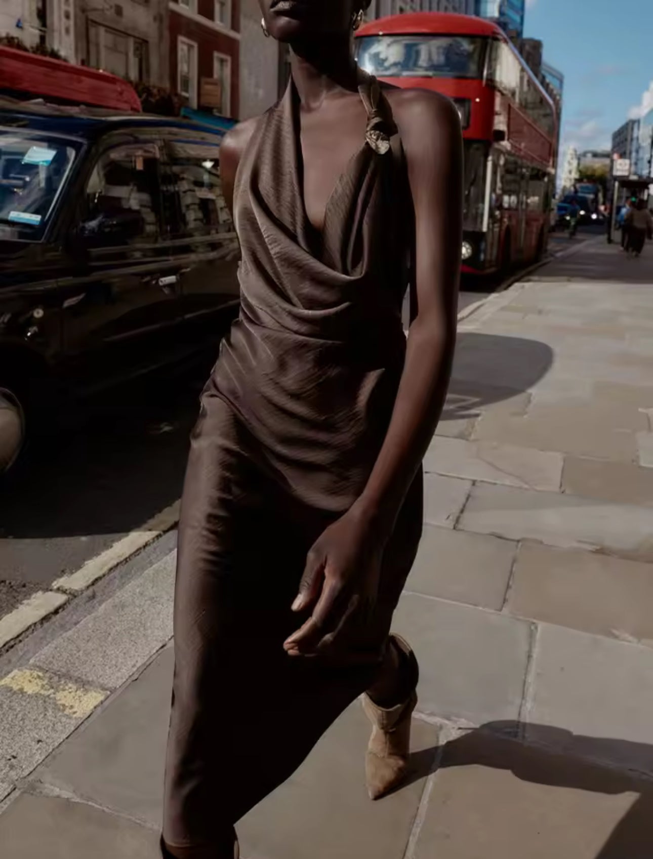 Dieses elegante Damenkleid aus glänzendem Satin ist der perfekte Begleiter für Sommernächte, Partys oder besondere Anlässe. Das figurbetonte Design mit asymmetrischem Schnitt, tiefem V-Ausschnitt und offenem Rücken vereint feminine Eleganz mit einem modernen Y2K-Streetwear-Look.