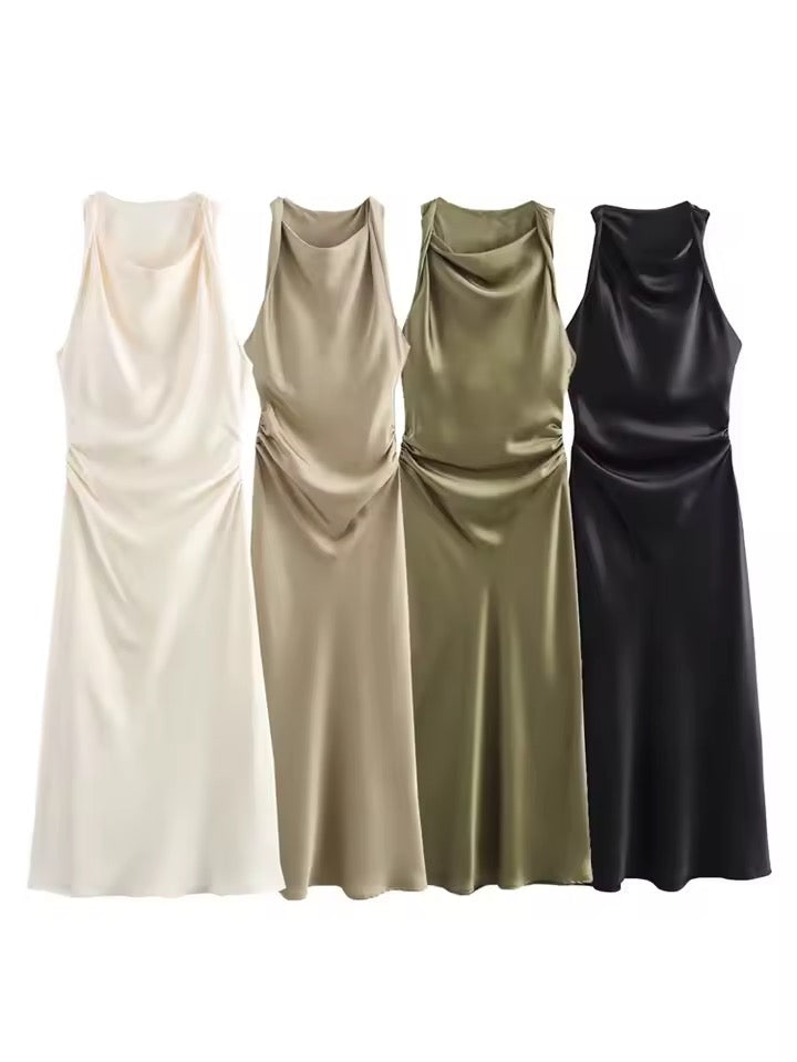 Dieses elegante Damenkleid aus hochwertigem Seidensatin ist die ideale Wahl für stilbewusste Frauen, die zeitlose Eleganz und modernen Minimalismus schätzen. Der fließende Stoff sorgt für eine sanfte Silhouette, während der klassische Rundhalsausschnitt und das ärmellose Design feminine Leichtigkeit verleihen.