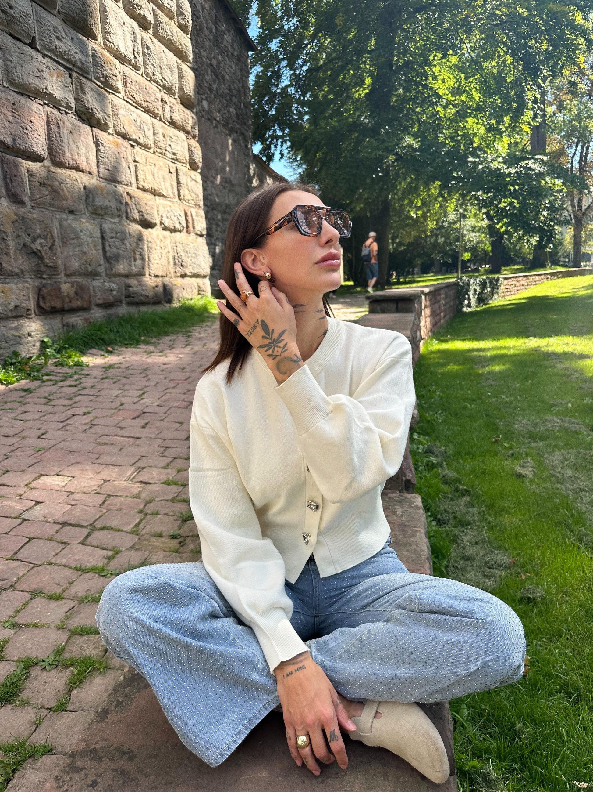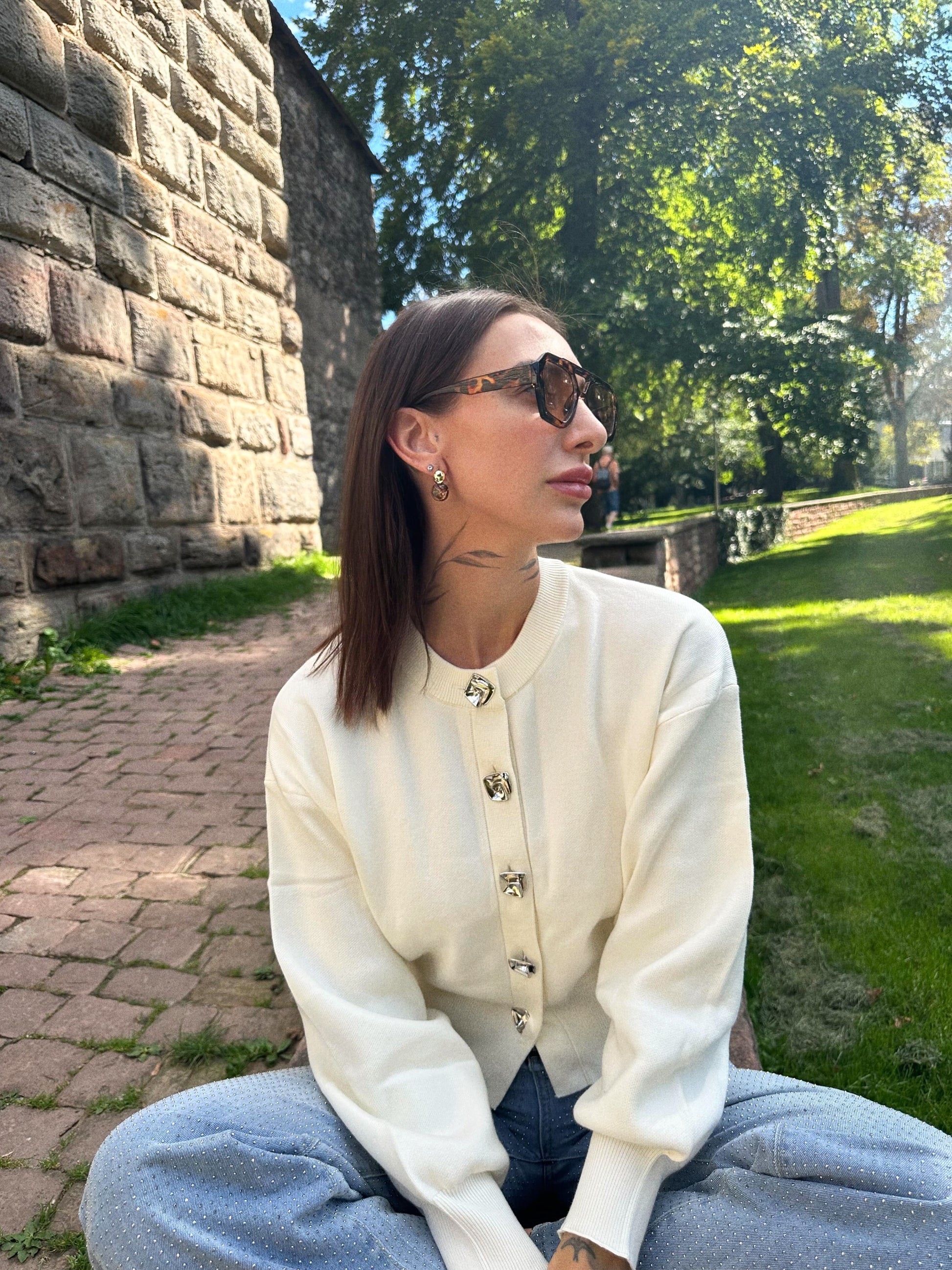 Dieses stilvolle Strickjacke vereint feminine Details mit modernem Minimalismus – perfekt für die Übergangszeit oder kühle Tage. Die einfarbige Strickjacke mit Rundhalsausschnitt und charmantem Blumenknopf verleiht dem Outfit einen Hauch von Verspieltheit.