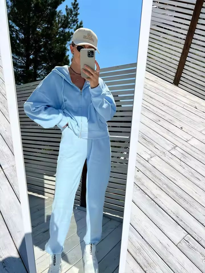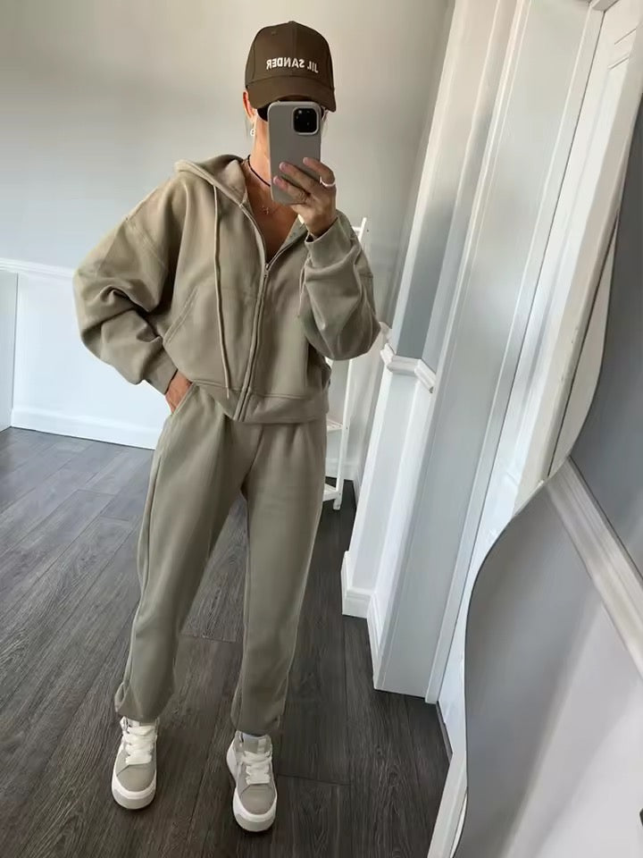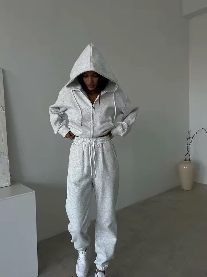 Dieser zweiteilige Damen-Trainingsanzug ist die perfekte Kombination aus Funktionalität und Mode. Das Kapuzensweatshirt mit Reißverschluss und Taschen bietet dir Bewegungsfreiheit und Komfort, während die gerade geschnittene Hose mit elastischem Bund für einen entspannten Sitz sorgt. Ob für Sport, Freizeit oder als gemütlicher Alltagslook – dieses Set passt immer.