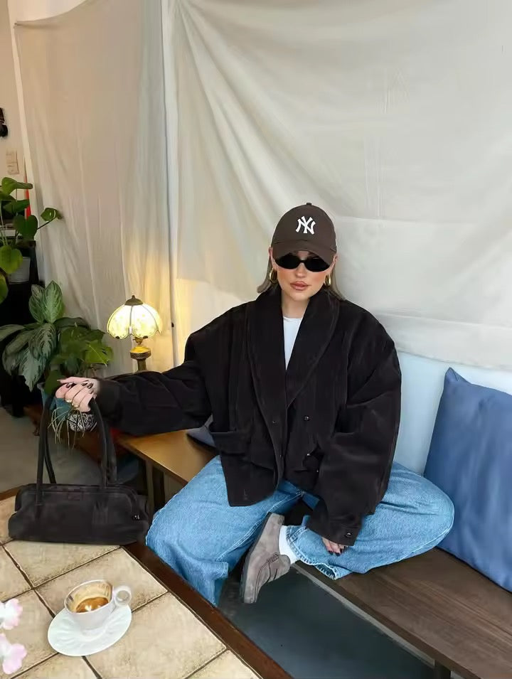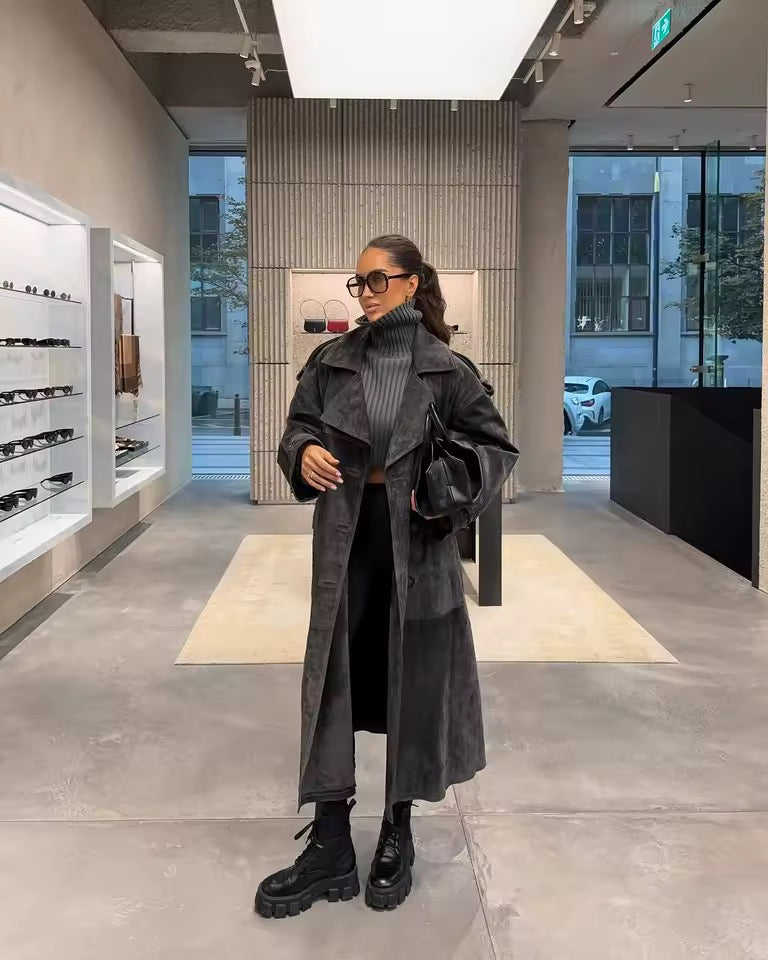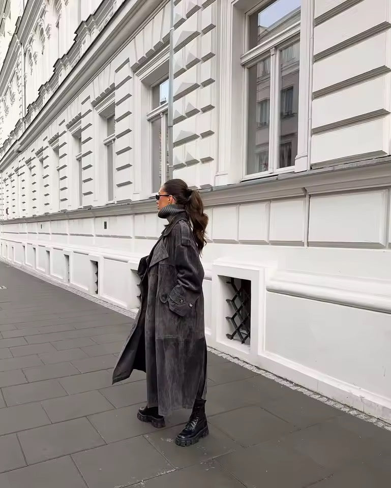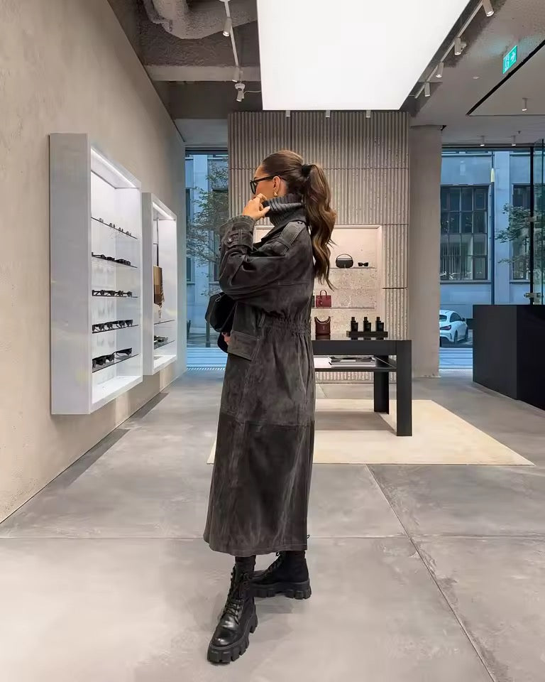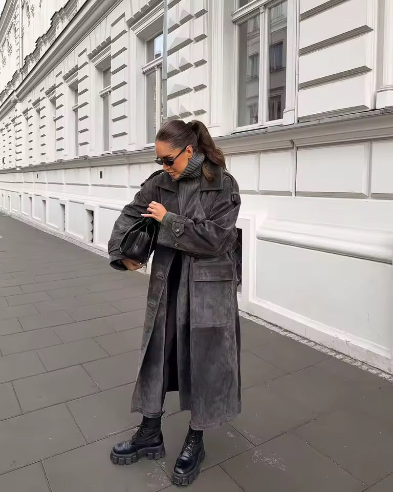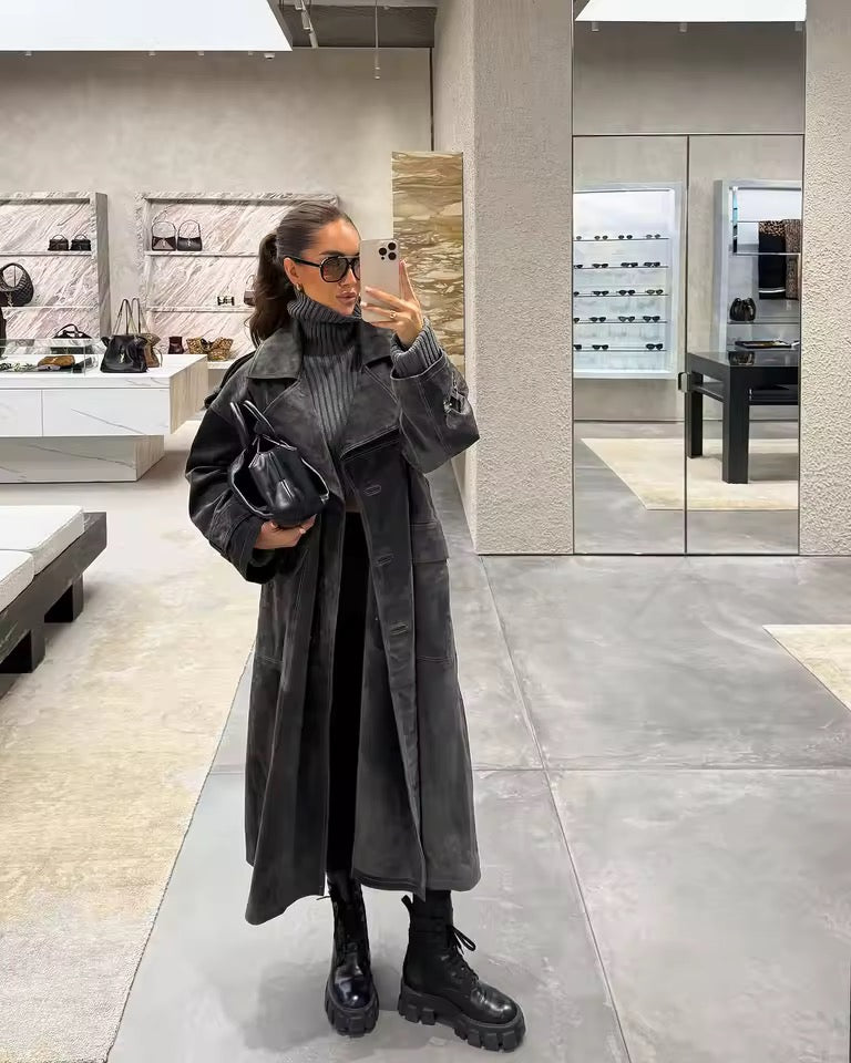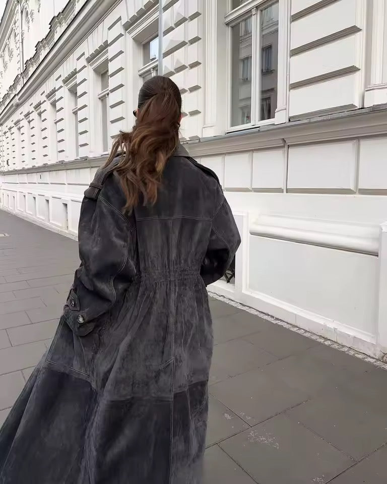 Diese lange Damenjacke aus hochwertigem Wildlederimitat ist ein echtes High-Street-Highlight für die Saison 2025. Der elegante Reverskragen und das klassische Einreiher-Design verleihen der Jacke eine anspruchsvolle, zeitlose Ausstrahlung.
