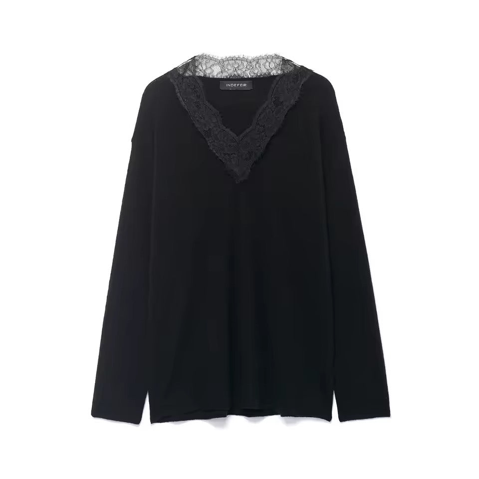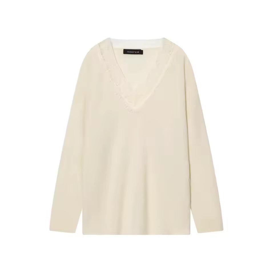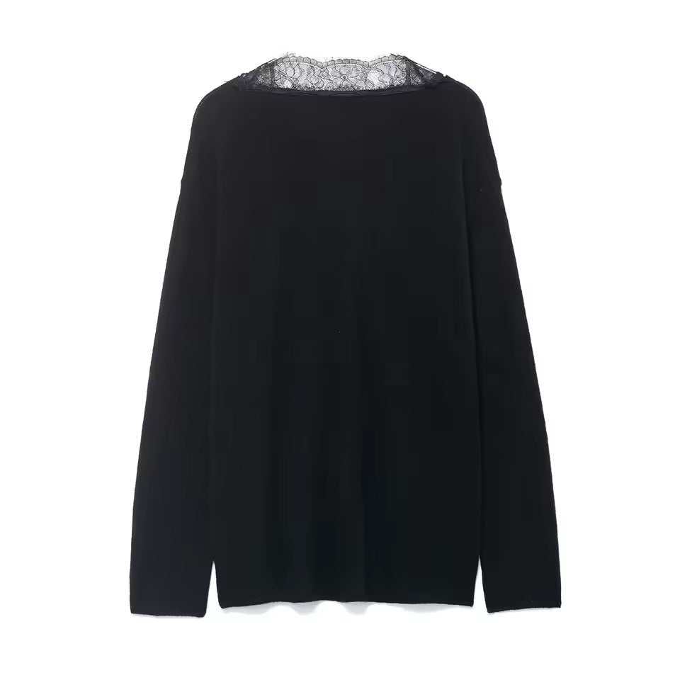 Dieser modische Damen-Strickpullover für Herbst und Winter überzeugt mit einem lässigen, lockeren Schnitt und stilvollen Details. Der feminine V-Ausschnitt in Kombination mit edlen Spitzen- und Patchwork-Elementen verleiht dem Pullover eine elegante Note, ohne auf Komfort zu verzichten.
