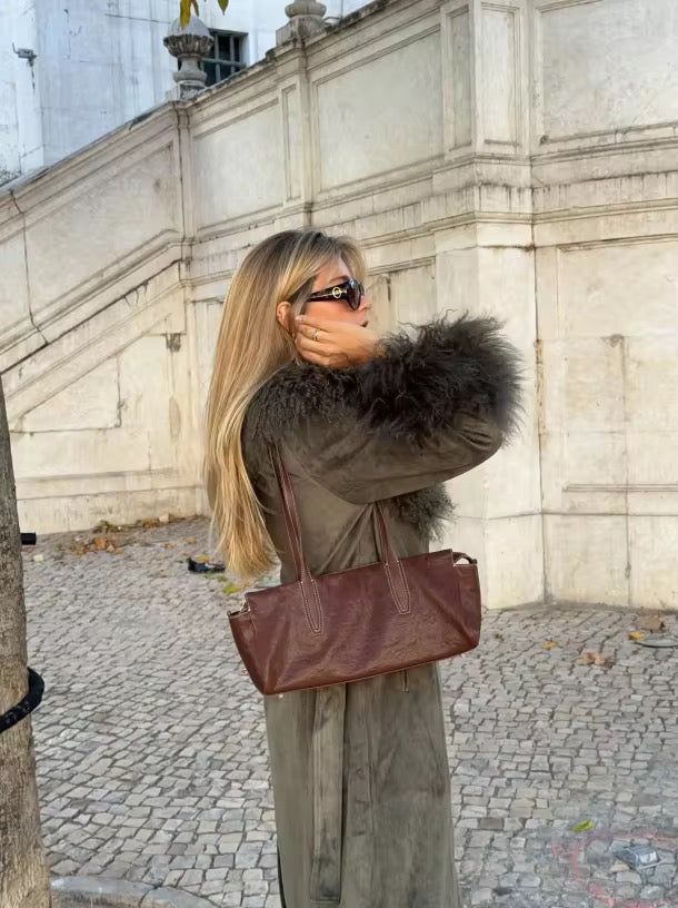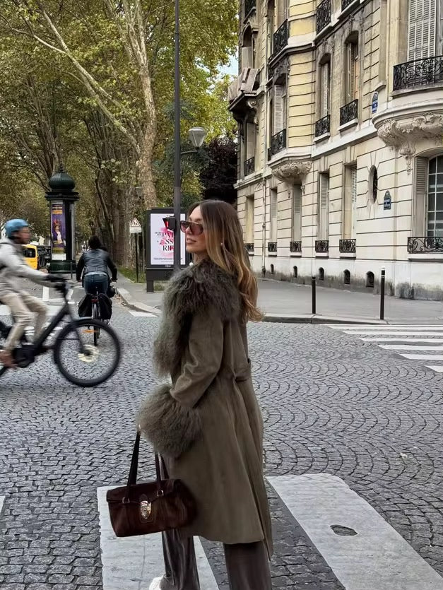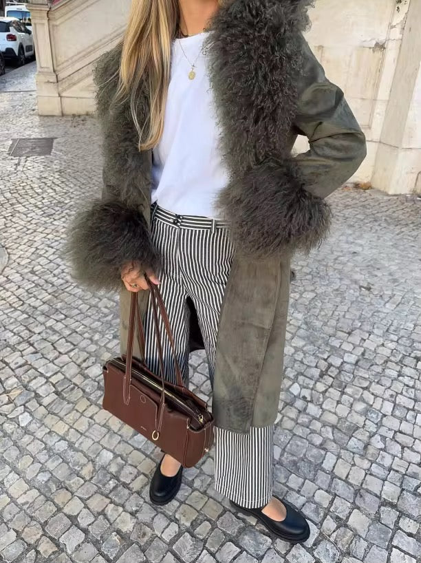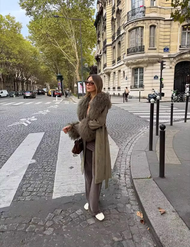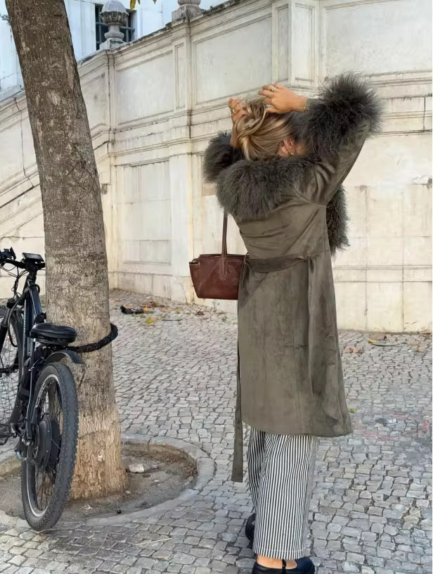Dieser stilvolle olivgrüne Damenmantel vereint moderne Eleganz mit warmem Winterkomfort. Der lange, zweireihige Schnitt verleiht dem Mantel eine zeitlose Silhouette, während der flauschige Kragen und die weichen Manschetten für besondere Gemütlichkeit und einen luxuriösen Look sorgen.