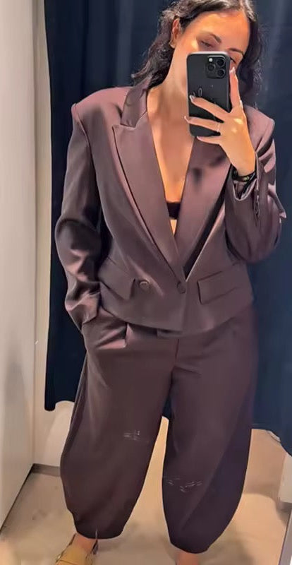 Dieses chice Satin-Anzugset kombiniert zeitlose Eleganz mit moderner Vielseitigkeit – perfekt für stilvolle Frauen, die im Alltag wie im Büro einen souveränen Auftritt lieben. Die edel glänzende Reversjacke mit Single-Button-Verschlusssorgt für eine klare, feminine Linie, während die lange, fließende Hose eine elegante Silhouette formt.