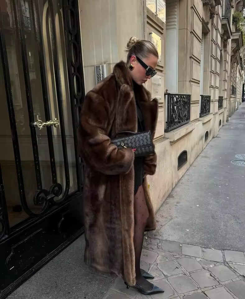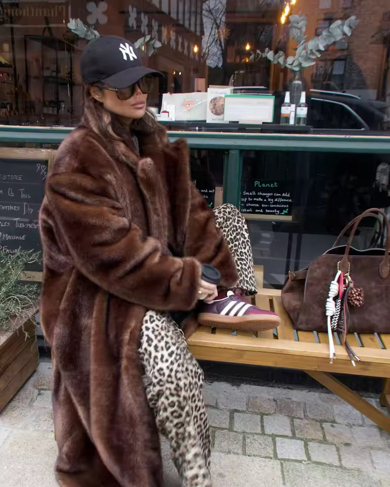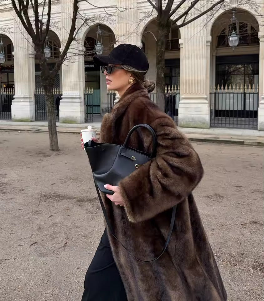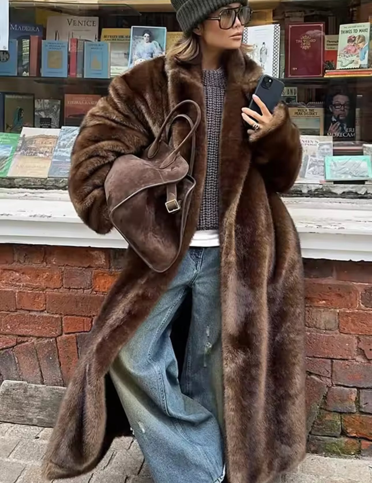 Dieser luxuriöse Damen‑Mantel verbindet elegantes Design mit wohliger Wärme – ideal für den Winter 2025! Gefertigt aus hochwertigem Kunstpelz (flauschiger Plüsch) in einem warmen Dunkelbraun‑Ton, zeigt sich das Modell mit einreihiger Knopfleiste, klassischem Trenchcoat‑Schnitt und langem, knie‑ oder auch knöchellangen Verlauf. Das Futter ist weich und komfortabel, der Mantel lässt sich problemlos über wärmender Kleidung tragen und sorgt zugleich für einen stilvollen Auftritt.