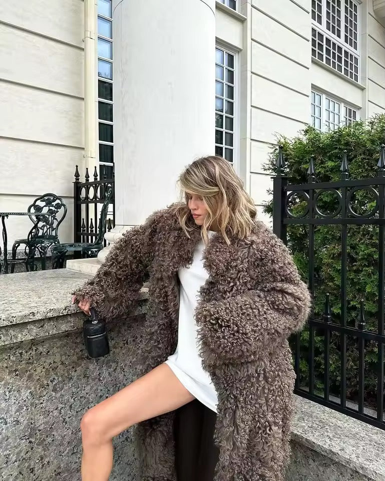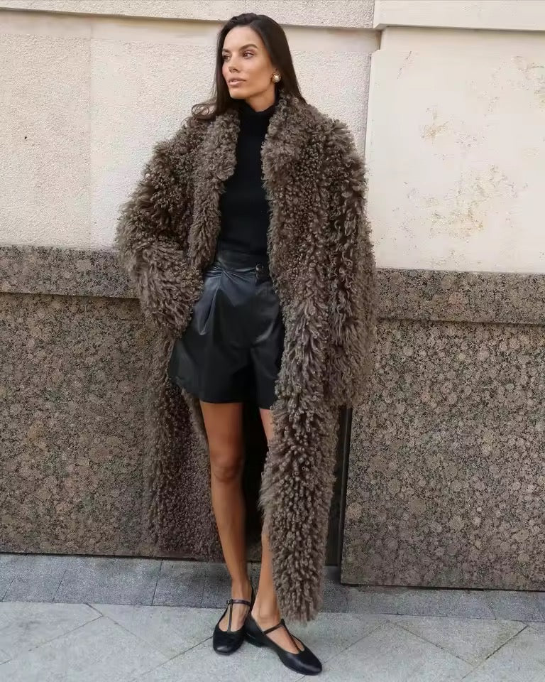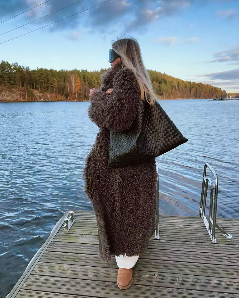 Dieser lange Damenmantel aus Lammfell-Optik vereint elegantes Design mit kuscheliger Wärme. Der stilvolle Reverskragen, die volle Ärmellänge und das hochwertige Kunst-Lammfell machen diesen Mantel zur perfekten Wahl für kalte Tage – ob in der Stadt, auf Reisen oder beim Spaziergang durch den Winter.