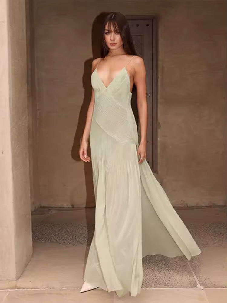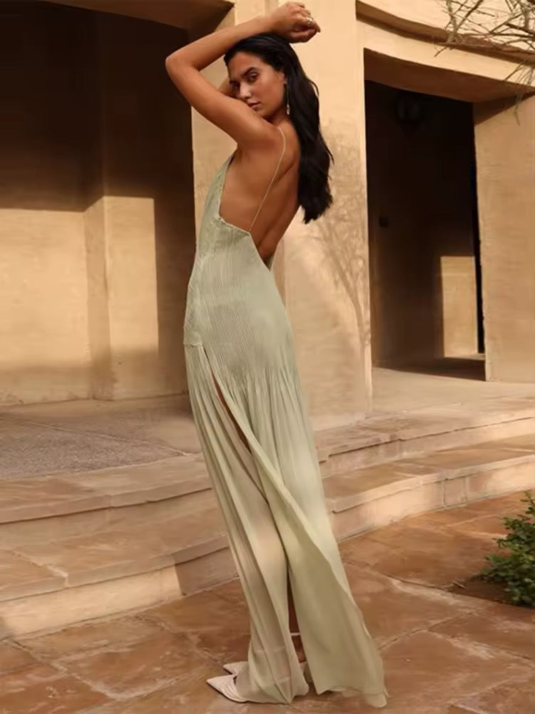 Produktbeschreibung: Erleben Sie pure Eleganz und Sinnlichkeit mit dem Sexy Gespleißten Langen Kleid für Frauen, das für jede Sommerparty, Strandveranstaltung oder abends im Club die perfekte Wahl ist. Das ärmellose Designund der V-Ausschnitt betonen Ihre feminine Ausstrahlung, während das Backless-Design den Look mit einem verführerischen Touch ergänzt. Der Plissee-Stoff sorgt nicht nur für eine elegante Silhouette, sondern verleiht dem Kleid auch einen besonders fließenden, luftigen Effekt, ideal für warme Sommerabende.