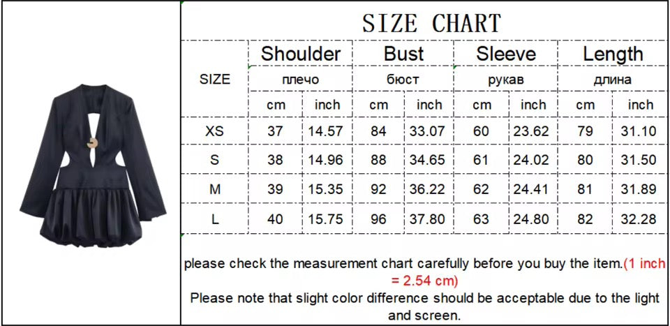 Der rückenfreie Schnitt sorgt für einen sinnlichen Blickfang, während die vollen, leicht aufgepufften Ärmel dem Kleid ein elegantes Volumen geben. Die Aushöhlungs- und Patchwork-Details setzen subtile Akzente und unterstreichen den trendigen Fashion-Look.