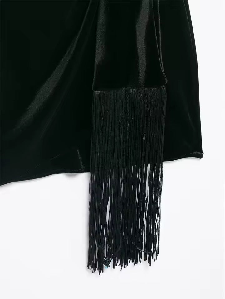 Die feinen Quasten-Details sorgen für einen dynamischen, modischen Look, der dem Kleid das gewisse Etwas verleiht. Der weiche Samtstoff bringt einen luxuriösen Glanz und macht das Kleid perfekt für Partys, Abendevents oder elegante Casual-Outfits.