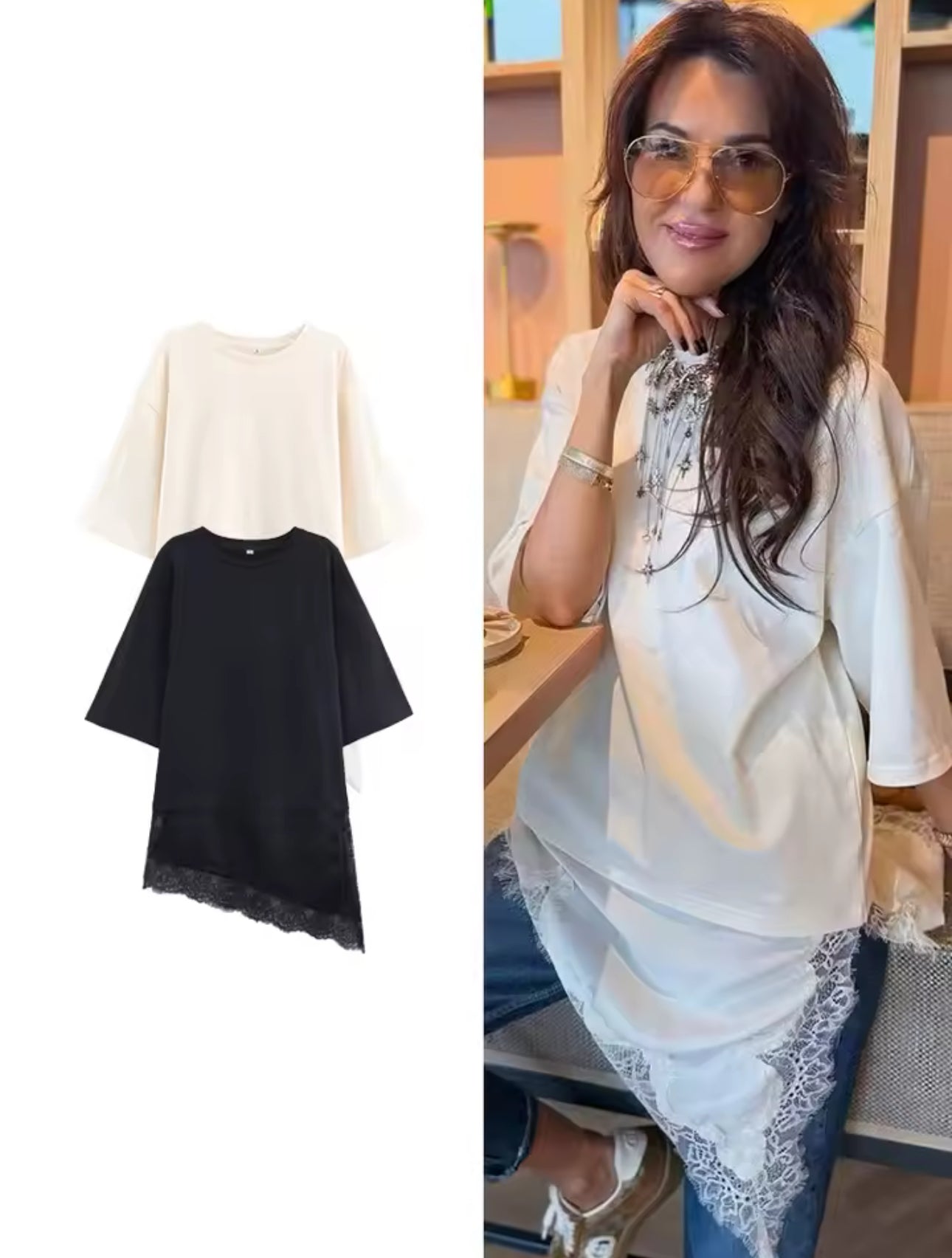 Das besondere Highlight ist das feine Spitzen-Patchwork, das dem Shirt einen edlen, hochwertigen Look verleiht. Der Loose Fit sorgt für angenehmen Tragekomfort und einen modernen Streetstyle-Touch – perfekt für Frauen, die Stil und Bequemlichkeit kombinieren möchten.