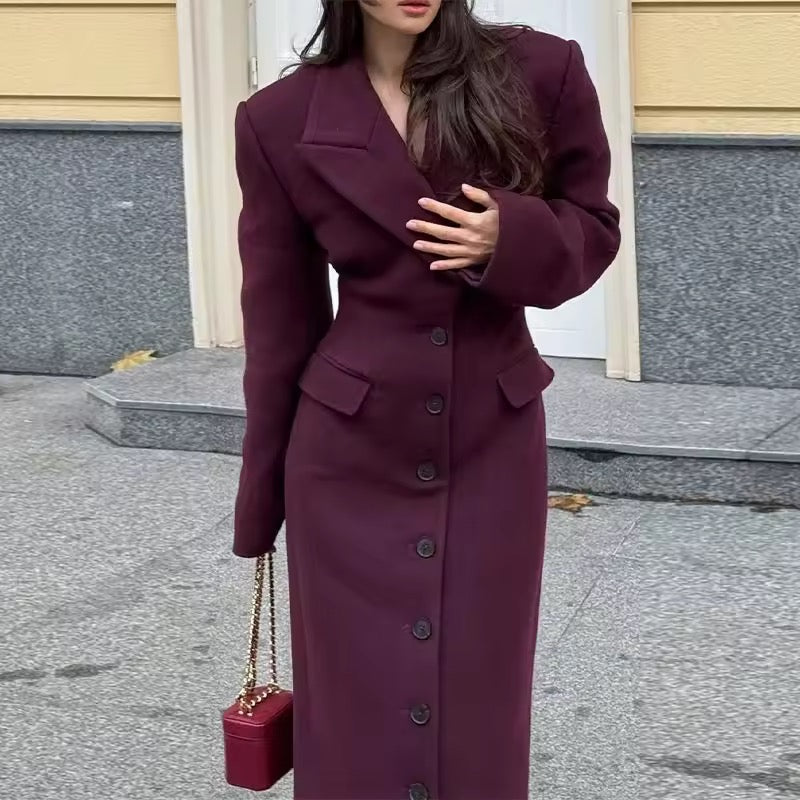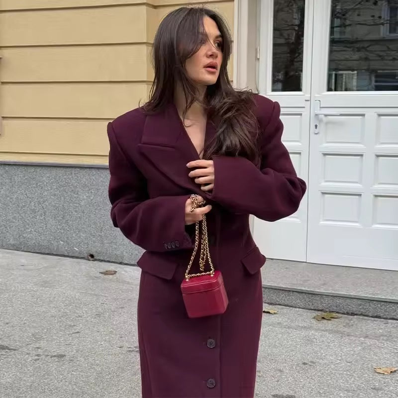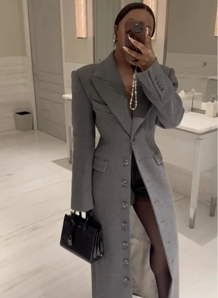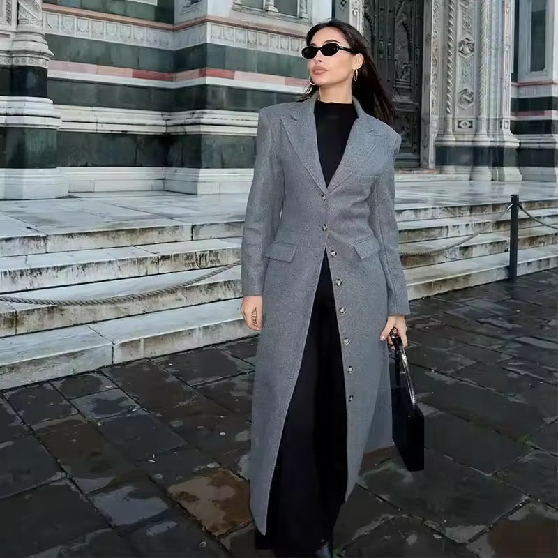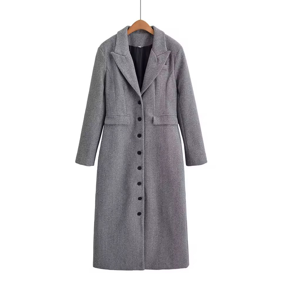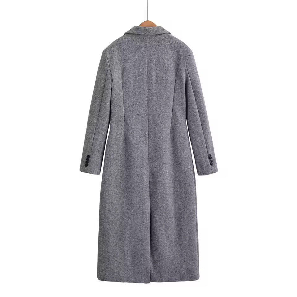 Bleiben Sie stilvoll und warm in der kühlen Jahreszeit mit diesem eleganten Damenmantel aus hochwertiger Wolle. Der einreihige Schnitt und die dezente Taillierung sorgen für eine feminine Silhouette, während das klassische Graublau vielseitig kombinierbar ist. Der lange Schnitt schützt vor Wind und Kälte, ohne an Eleganz zu verlieren – perfekt für Büro, City oder Freizeit.